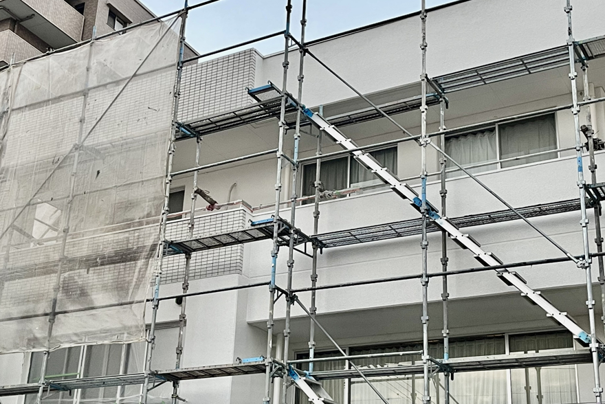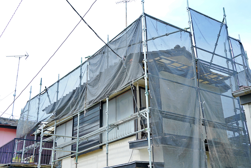 外壁塗装をするための足場架設を行います。このとき周囲に塗料などが飛び散らないように飛散防止ネットなどが張られます。