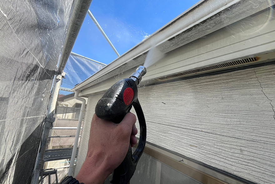 建物に付着している埃や汚れ、苔などを洗い落とします。この作業は下処理の一部であり、外壁塗装を行う上で大切な作業のひとつです。これが不十分ですと塗り替え後の「ふくれ」や「剥がれ」などといった塗膜欠陥を引き起こします。